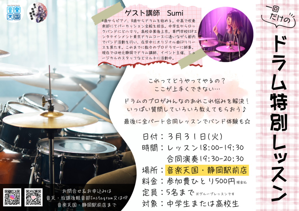 ※静岡駅前店のドラムレッスンは定員に達した為、募集を締め切りました