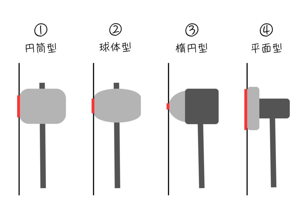 ①円筒型 … 最も一般的で、どの面でも同じように当たるため、安定したサウンドが得やすい