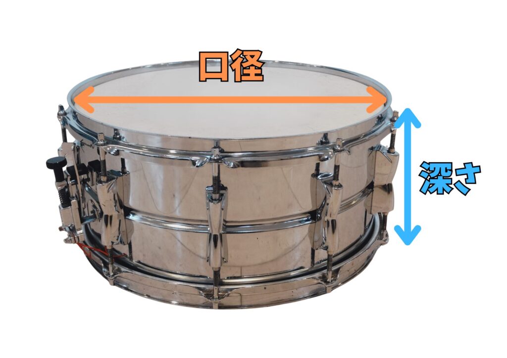 口径とは、スネア自体の円の大きさの事。口径が大きくなればなるほど、低い音が出るようになっていて、小さくなればなるほど、高い音が出るようになっています。