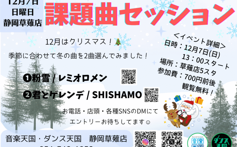 日時:2025年12月13日(土) 15:00~17:00場所:音楽天国・静岡駅前店参加費:スタジオ代割勘(当日現金払い)課題曲そばかす/♪JUDY AND MARY1/3の純情な感情/♪SIAM SHADEエントリー受付中!お問い合わせ ...