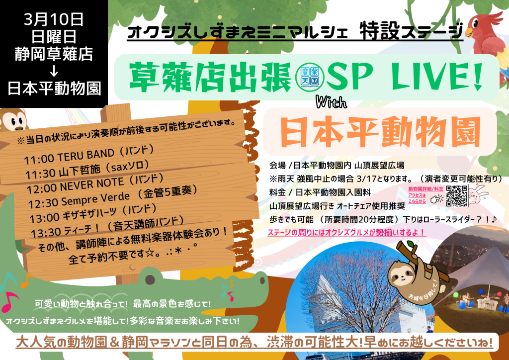 終了しました【2024年3月10日(日) 音楽天国・静岡草薙店】出張SPLIVE With 日本平動物園 オクシズしずまえミニマルシェ 2024.02.142024.03.12 草薙店出張SPLIVE日本平動物園 オクシズしずまえミニマルシェ の特設ステージにておじゃま致します! 草薙店ゆかりのバンドさんの演奏、金管奏!音楽天国教室 講師陣のスペシャルバンドも初登場!空き間には無料楽器体験会も! 可愛い動物!美味しいグルメ!開放的な景色!そして音楽! オートチェアにのってお城のある山頂展望広場に遊びに来てね! ※入場料は日本平動物園HPをご覧下さい。