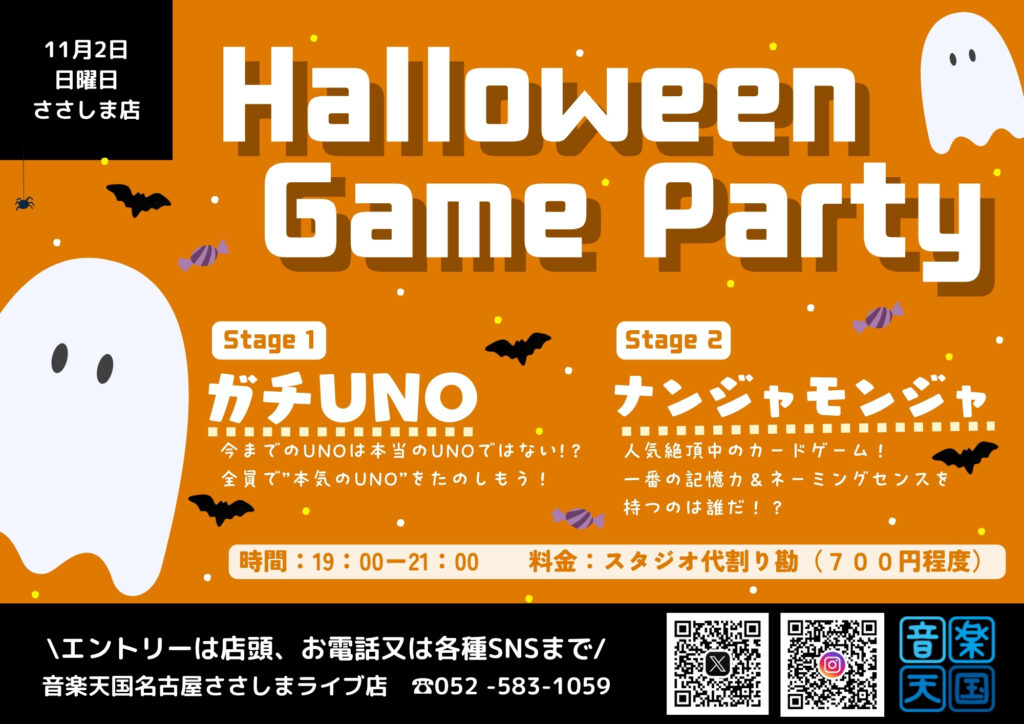 【2025年11月2日(日)音楽天国・ダンス天国名古屋ささしまライブ店】ハロウィンイベント 2025.10.14 【Halloween Game Party!!!】 2日遅れのハロウィンパーティー!すっかりスタジオでのゲームイベントにハマってしまったささしま店今回は『ガチUNO』と『ナンジャモンジャ』を開催! お菓子を食べながら7stでゆったりゲームしましょう? エントリーは店頭、お電話、または各種SNS DMまで!