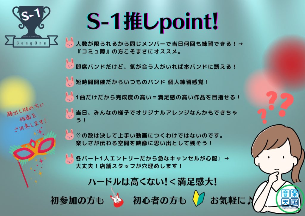 終了しました【2023年3月20日(月)音楽天国・静岡草薙店】S-1 vol.3 空も飛べるはず 2023.02.052023.03.22 3/20草薙店 スタジオ 20時から21時半 参加費800円程度 お待たせしました!S-1 3回目の募集です! 今回は卒業 新たなスタートを意識した選曲、みんな大好きなスピッツより名曲の『空も飛べるはず』をチョイスしました! お子様から大人な方まで幅広く知られている曲なのでセッションしやすいですね! 各パート1名ずつのみの募集なので、お早めにご連絡をお願い致します。 最新のエントリー状況は店舗までお問い合わせをお願い致します!