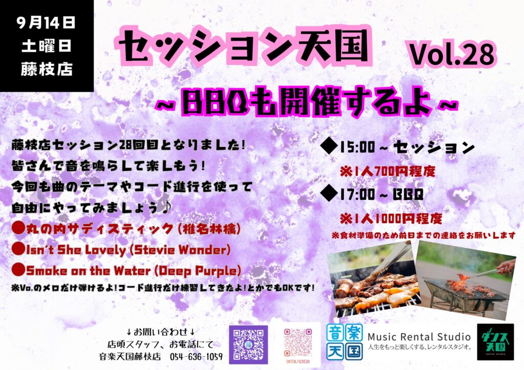 終了しました【2024年9月14日(土) 音楽天国・藤枝店】セッション天国Vol.28~BBQも開催するよ~ 2024.09.092024.09.30 皆で音を鳴らして楽しもう!セッション定番曲やコード進行を使って自由に演奏♪興味あるけど難しそう…そんな方は見学やコードを弾くだけの参加も大歓迎です