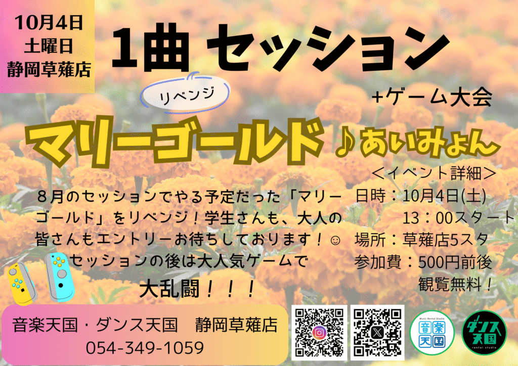 【2025年10月4日(土) 音楽天国・静岡草薙店】1曲セッション+ゲーム大会 2025.08.182025.09.03 日時:2025年10月4日(土) 13:00~場所:音楽天国・静岡草薙店参加費:500円程度(当日現金払い) 課題曲マリーゴールド/♪あいみょん セッションしたら大人気ゲームでみんなで大乱闘!!! お問い合わせ 054-349-1059