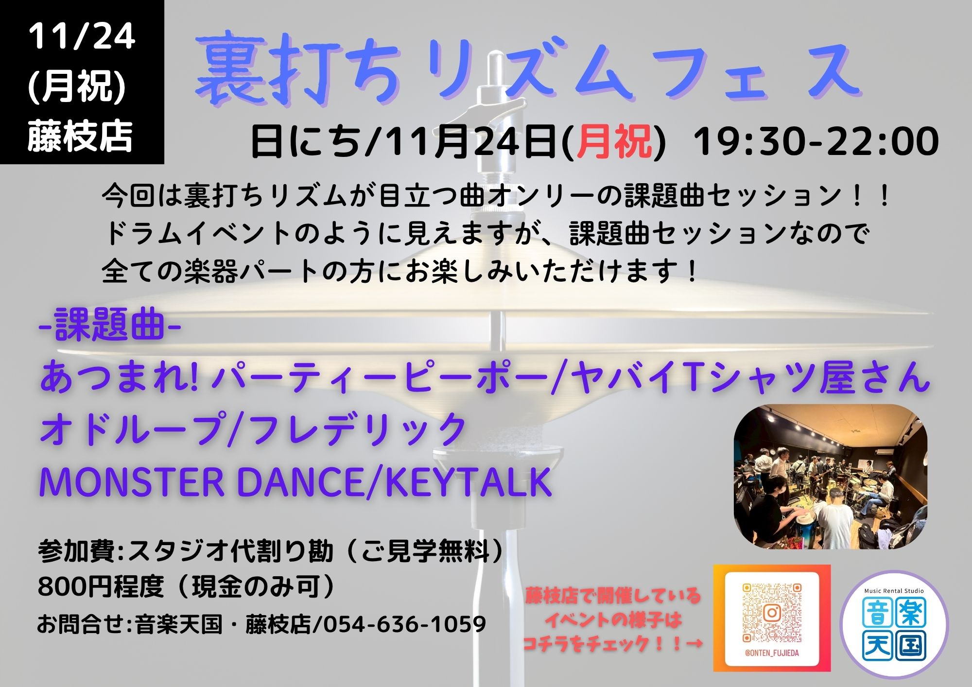 【2025年11月24日(月) 音楽天国・藤枝店】裏打ちリズムフェス 2025.11.02 日時:2025年11月24日(月) 19:30~22:00場所:音楽天国・藤枝店参加費:800円程度(当日現金払い) 課題曲あつまれ!パーティーピーポー/♪ヤバイTシャツ屋さんオドループ/♪フレデリックMONSTER DANCE/♪KEYTALK 今回は裏打ちリズムが目立つ曲オンリーの課題曲セッション!ドラムイベント…ではないので全パートの皆様にお楽しみいただけます♪ お問合せ:054-636-1059
