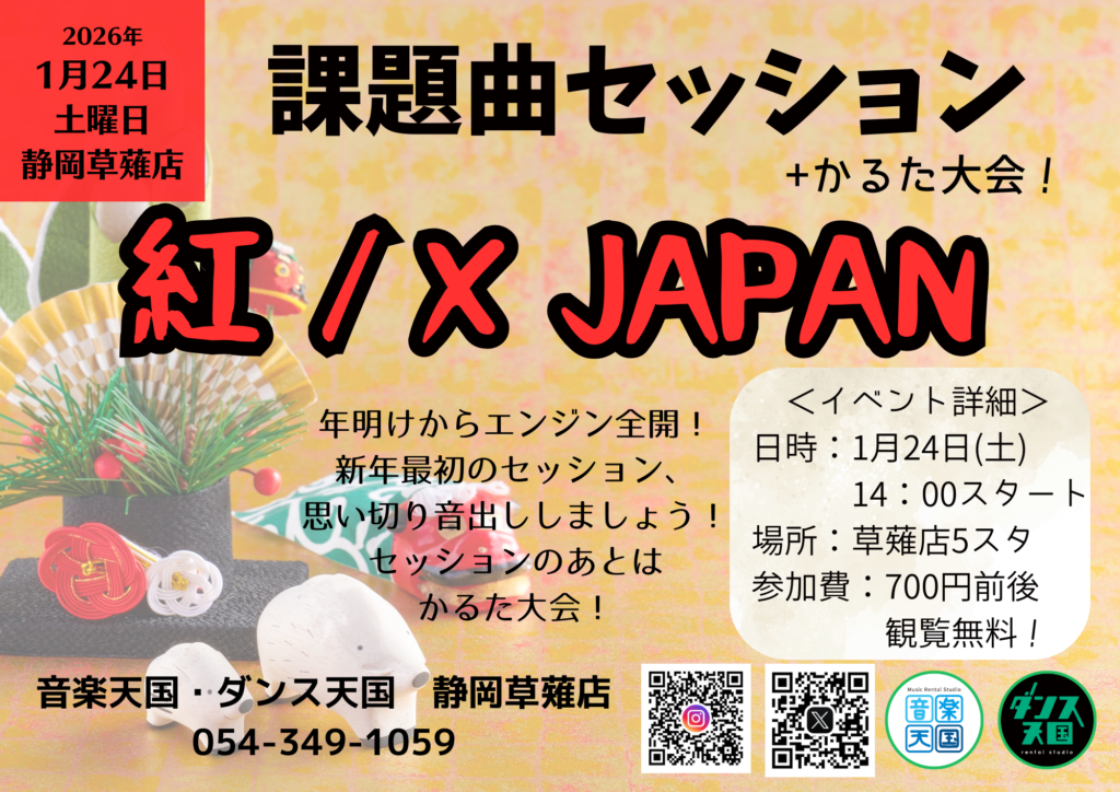 【2026年1月24日(土) 音楽天国・静岡草薙店】課題曲セッション+かるた大会! 2025.12.14 日時:2026年1月24日(土) 14:00~場所:音楽天国・静岡草薙店参加費:700円程度(当日現金払い) 課題曲紅/♪X Japan 年明けからエンジン全開!新年初のセッション、思い切り音出ししましょう!セッションのあとは かるた大会! お問い合わせ 054-349-1059