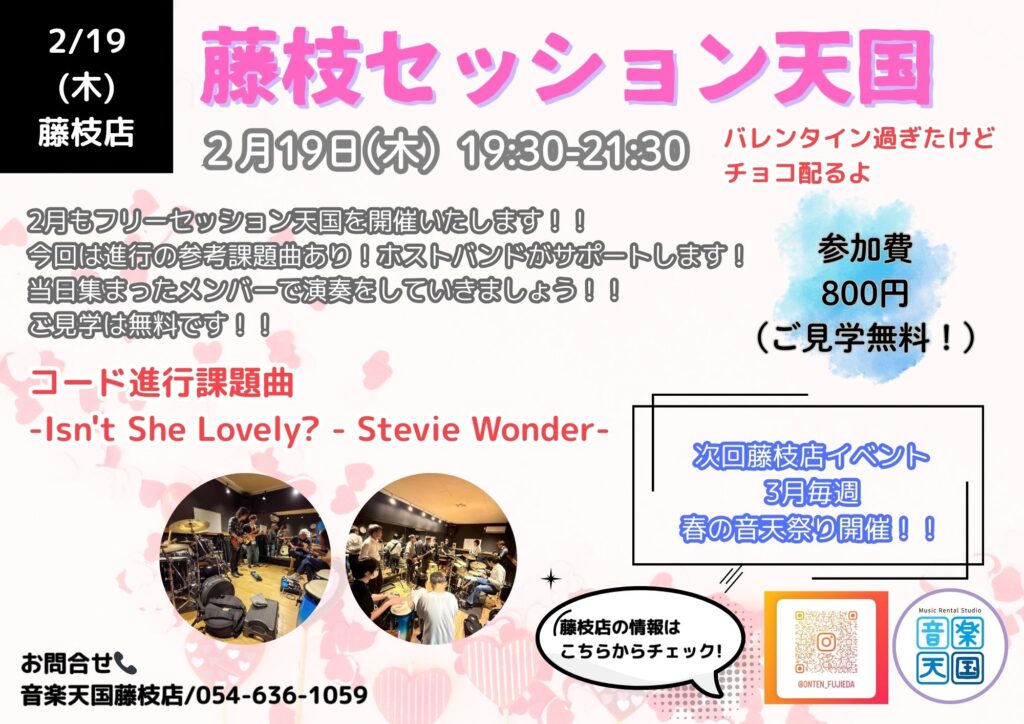 【2026年2月19日(木) 音楽天国・藤枝店】藤枝セッション天国 2026.01.10 日時:2026年2月19日(木) 19:30~21:30場所:音楽天国・藤枝店参加費:800円程度(当日現金払い) 2月もフリーセッション天国を開催いたします!!今回は進行の参考課題曲あり!ホストバンドがサポートします!当日集まったメンバーで演奏をしていきましょう!!ご見学は無料です!! コード進行課題曲-Isn’t She Lovely?- ♪StevieWonder お問合せ054-636-1059