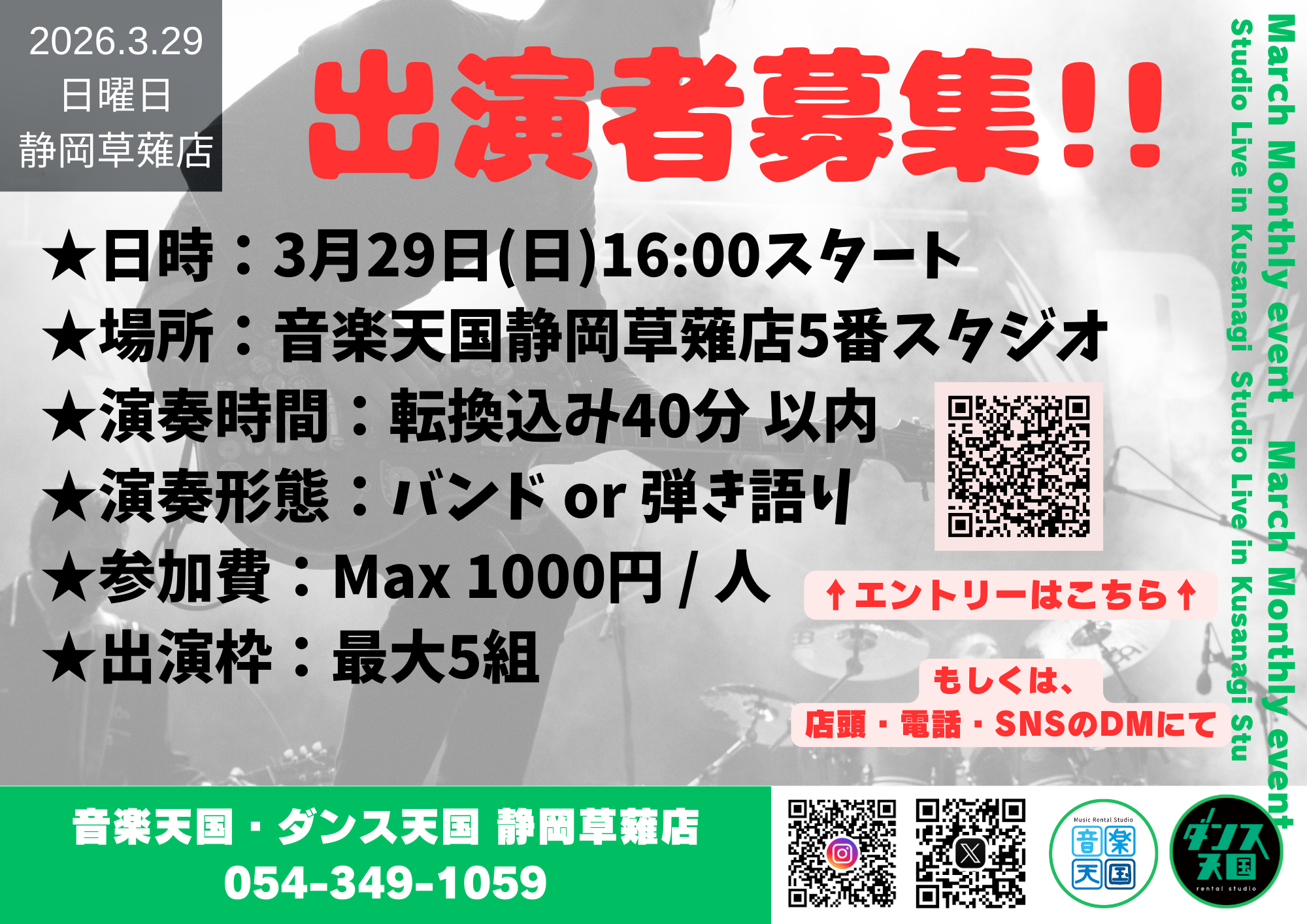 【2026年3月29日(日) 音楽天国・静岡草薙店】スタジオライブ~出演者募集~ 2026.01.29 日時:2026年3月29日(日)場所:音楽天国・静岡草薙店 5studio演奏時間:転換込40分以内演奏形態:バンドor弾き語り出演費:Max1000円/人出演枠:最大5組 エントリーお待ちしております054-349-1059
