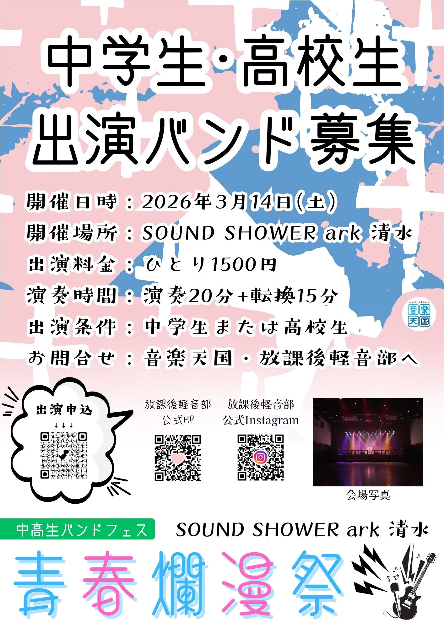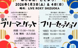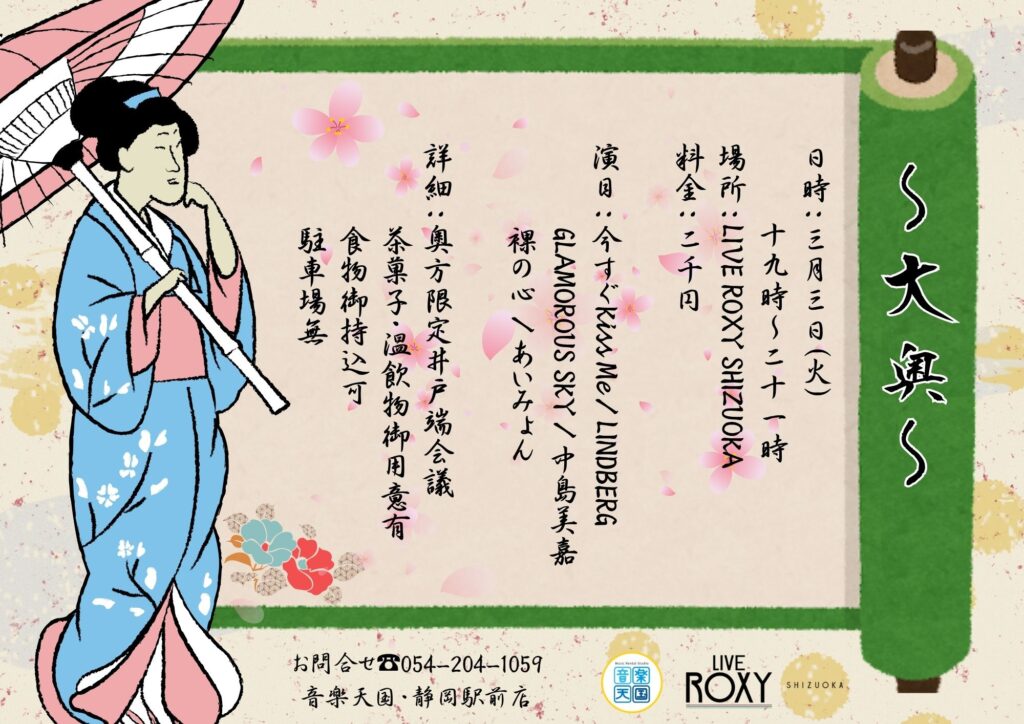 【2026年3月3日(火) 音楽天国】女性限定セッション~大奥~ 2025.11.20 日付:2026年3月3日(火)時間:19時?21時場所:LIVE ROXY SHIZUOKA参加:ひとり2000円(お菓子付き) 奥方限定井戸端会議お菓子と温かいお飲み物ありますセッションもやるけどお茶会メイン??是非ご参加ください お問合せ:054-204-1059(音楽天国・静岡駅前店)
