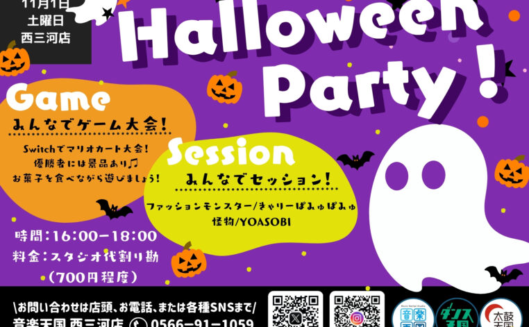 イベント情報 【2025年11月1日(土)音楽天国・太鼓天国・ダンス天国西三河店】ハロウィンイベント 【Halloween Party!!!!】1日遅れのハロウィンパーティー1番大きいお部屋でみんなでゲーム&セッション会!片方の参加も大歓迎です??もちろん!仮装での参加もお待ちしております☆エントリーは店頭、お電話、または各種SNS DMま... イベント情報セッション系交流系西三河店のお知らせ