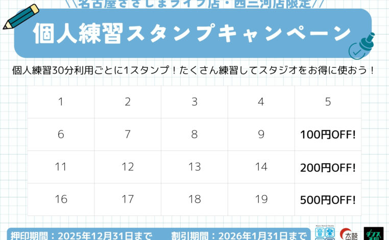 お知らせ 【個人練習スタンプキャンペーン】音楽天国・ダンス天国名古屋ささしまライブ店&音楽天国・太鼓天国・ダンス天国西三河店 【\\個人練習スタンプキャンペーン//】*名古屋ささしまライブ店・西三河店限定*個人練習でスタジオをお得に使おう!30分利用ごとに1スタンプスタンプ数に応じてスタジオがお得にご利用できちゃいます?年末までにたくさん練習してスキルを磨いちゃい... お知らせ名古屋ささしまライブ店のお知らせ西三河店のお知らせ